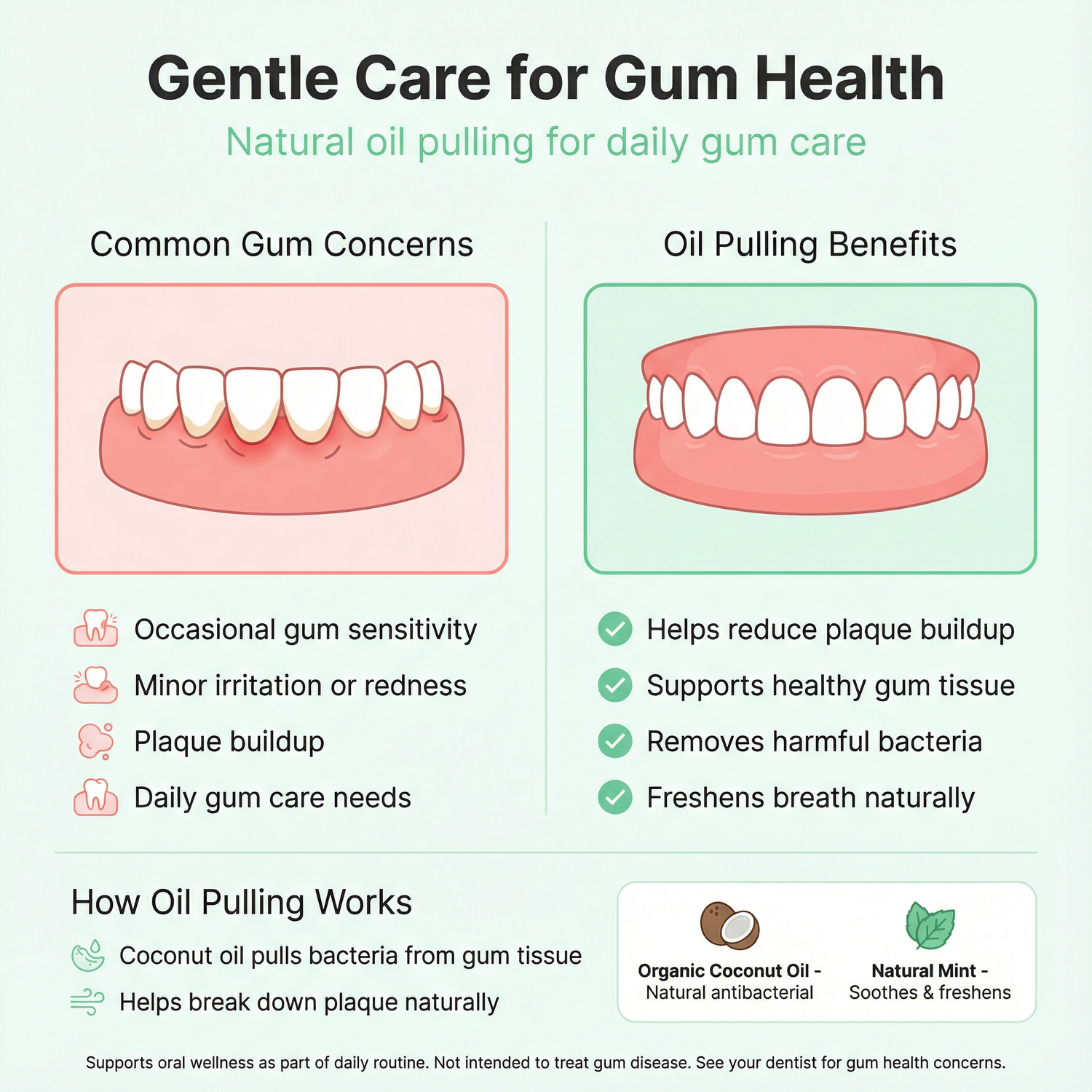 Daily oil pulling with Pure Rinse helps reduce plaque buildup, supports healthy gum tissue, and removes harmful bacteria naturally. Experience fresher breath and healthier gums with just 10 minutes a day.