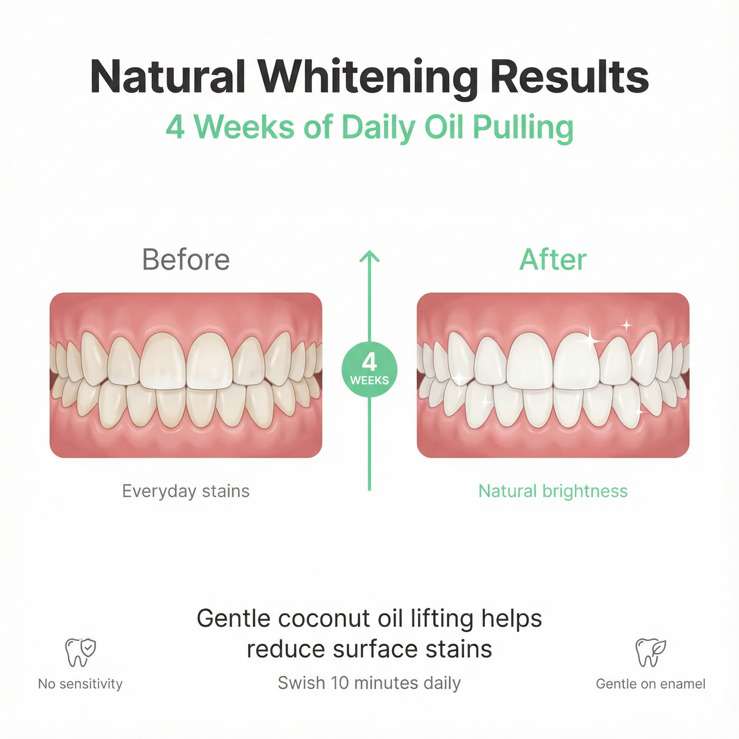 Gentle coconut oil helps lift surface stains from coffee, tea, and everyday foods. See gradual, natural brightening in 2-4 weeks without harsh chemicals or sensitivity.